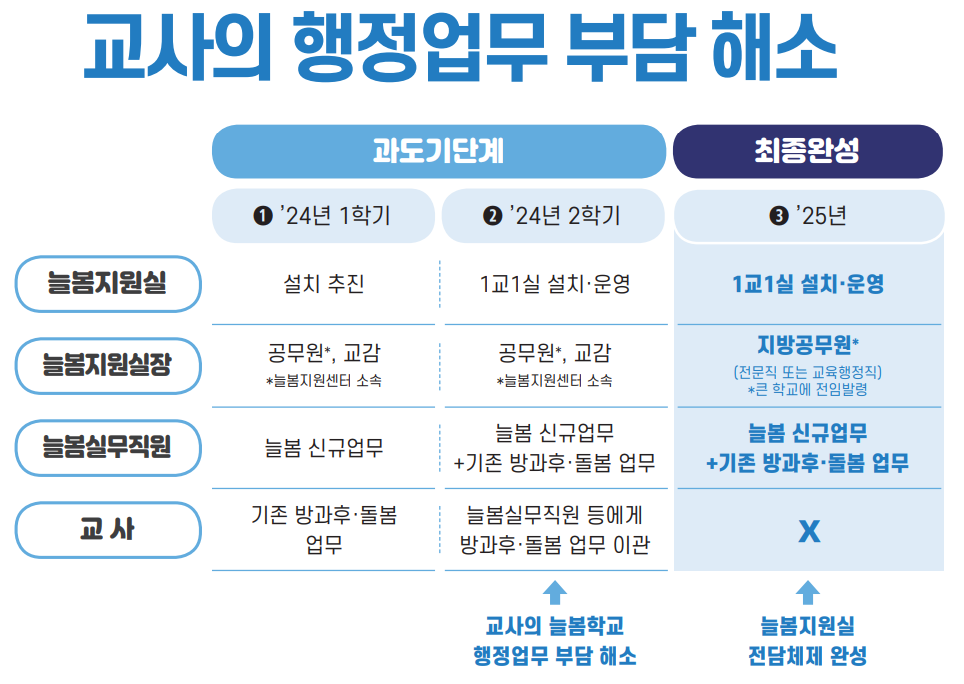 - 교원의 행정업무 부담 경감: 교사들이 교육 활동에 더 집중할 수 있도록 늘봄학교 프로그램은 교사들의 행정업무 부담을 줄이는 방안을 모색하고 있습니다. 이를 통해 교사들은 학생들의 학습과 성장을 위한 질 높은 교육을 제공할 수 있게 됩니다.